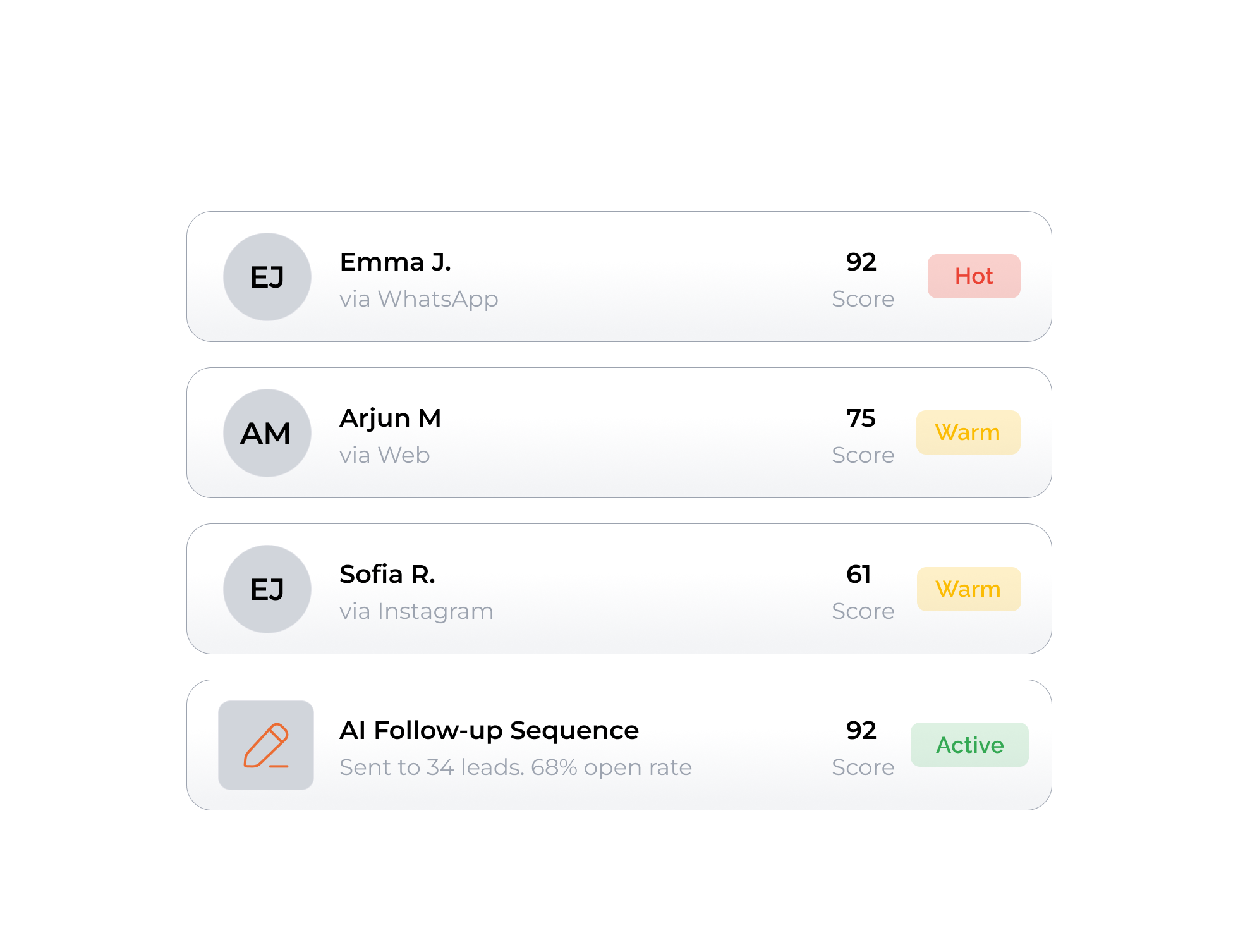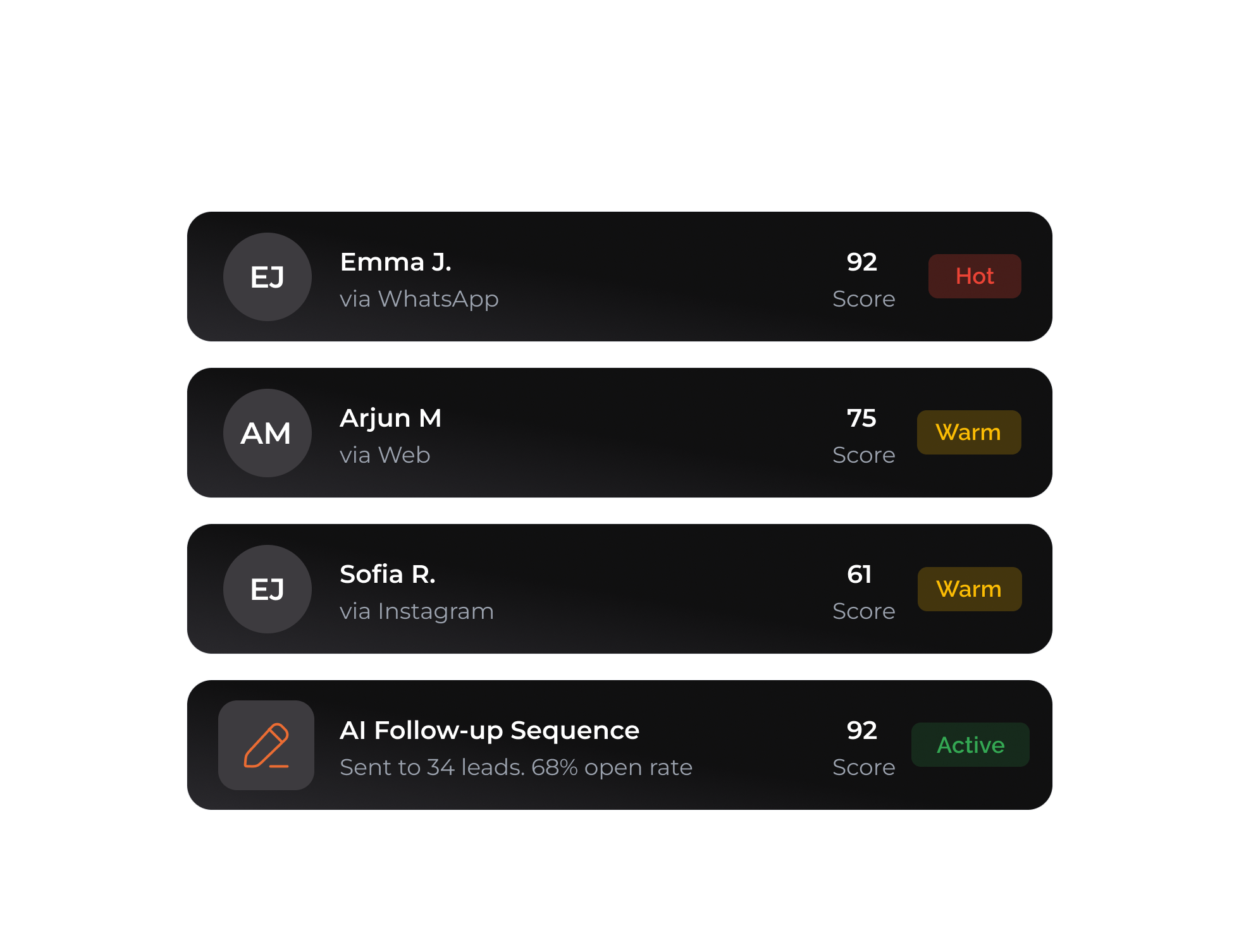 Every conversation is a potential deal. Dunefox scores and qualifies leads in real time across every channel — WhatsApp, web, Instagram, and more. Automated follow-up sequences nurture prospects while your team focuses only on leads that are ready to convert.