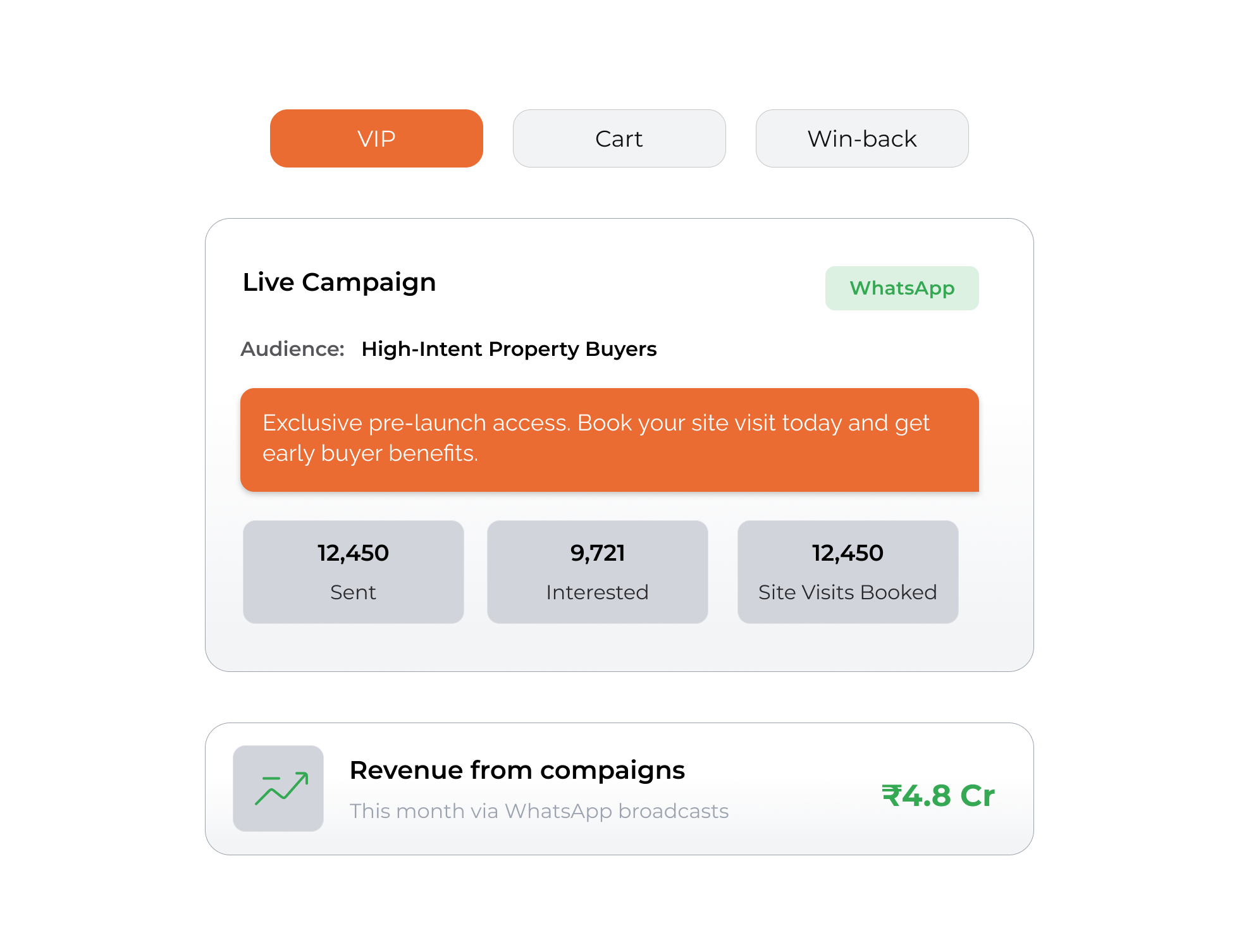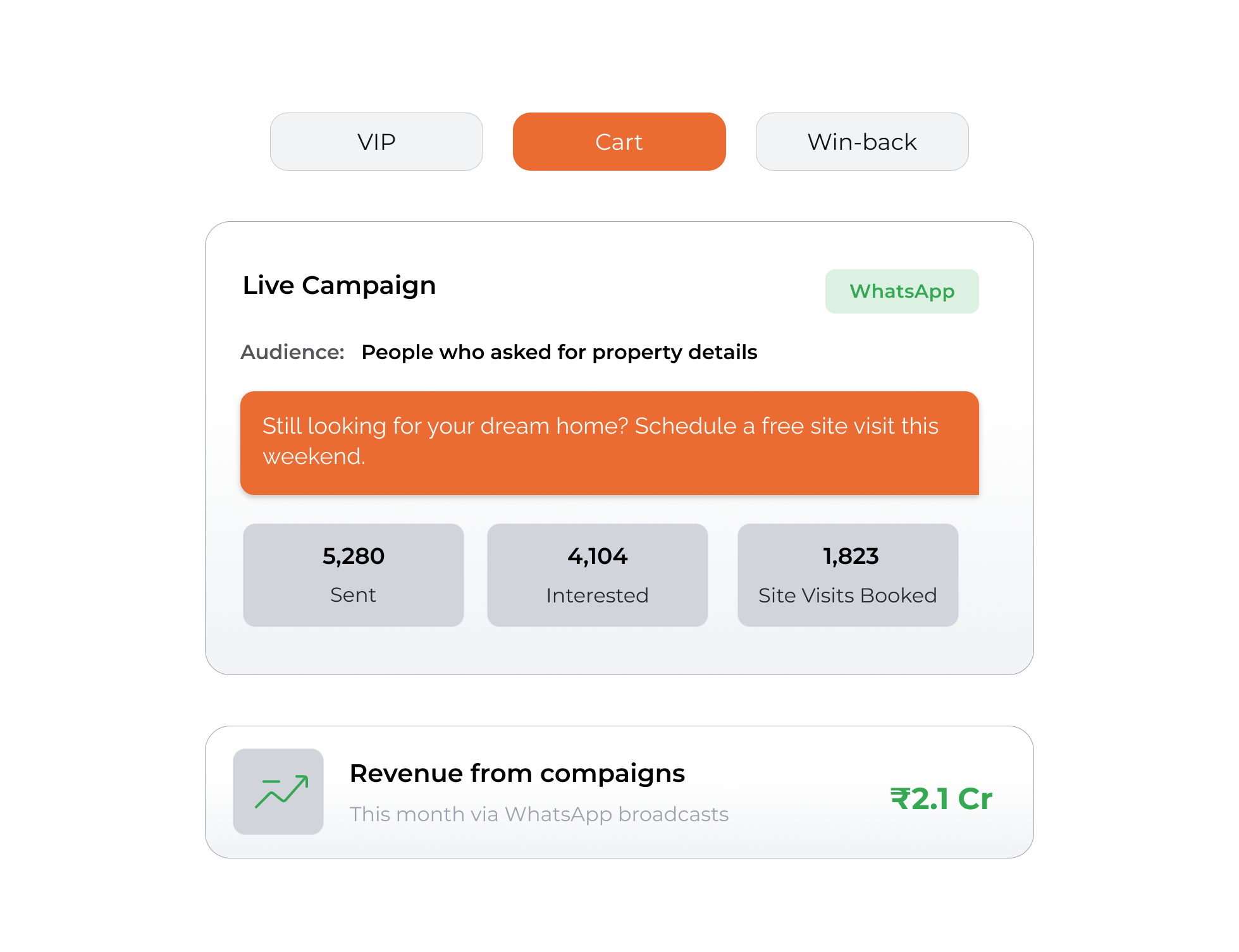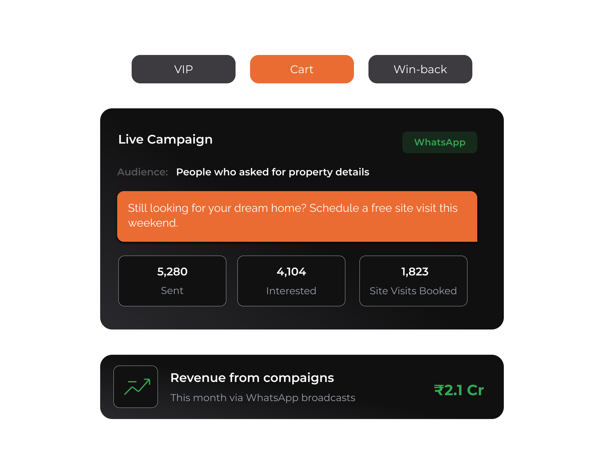 Launch personalised WhatsApp broadcast campaigns to segmented audiences in minutes. Re-engage dormant customers, recover abandoned carts, and run outbound sequences — all tracked with delivery, open-rate, reply, and revenue attribution in one dashboard.