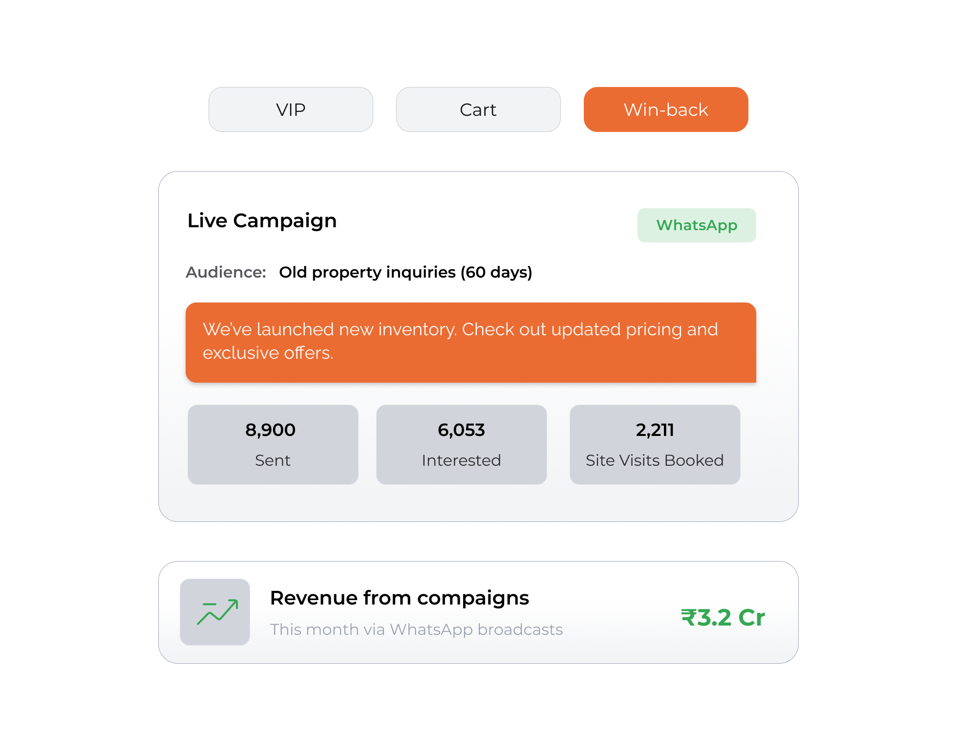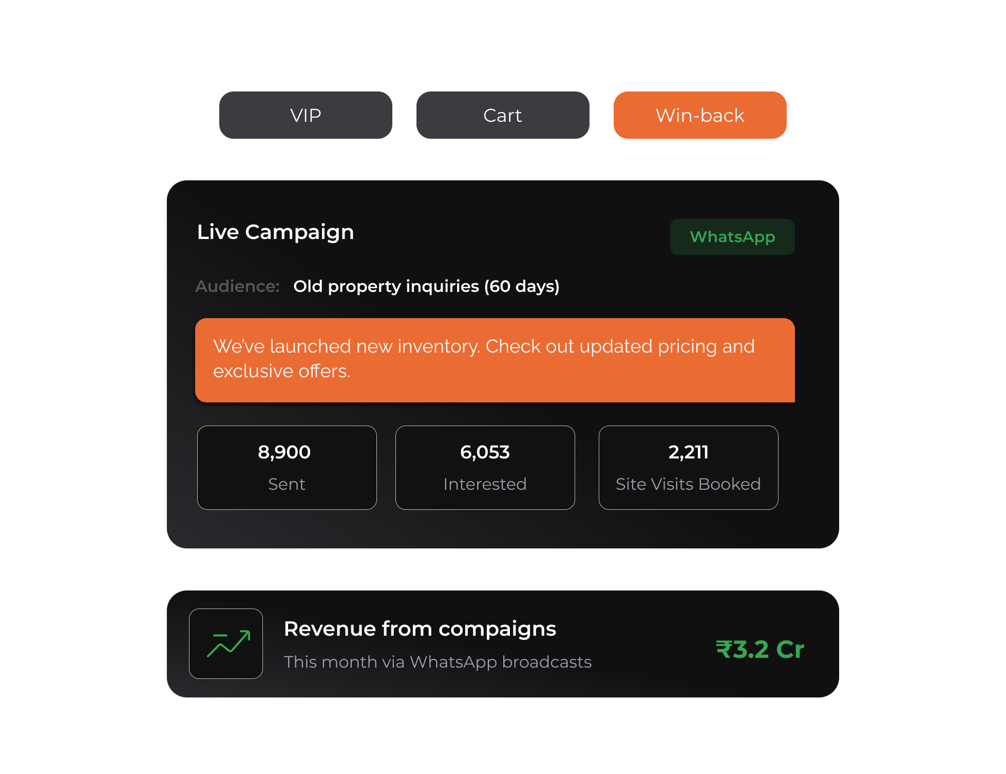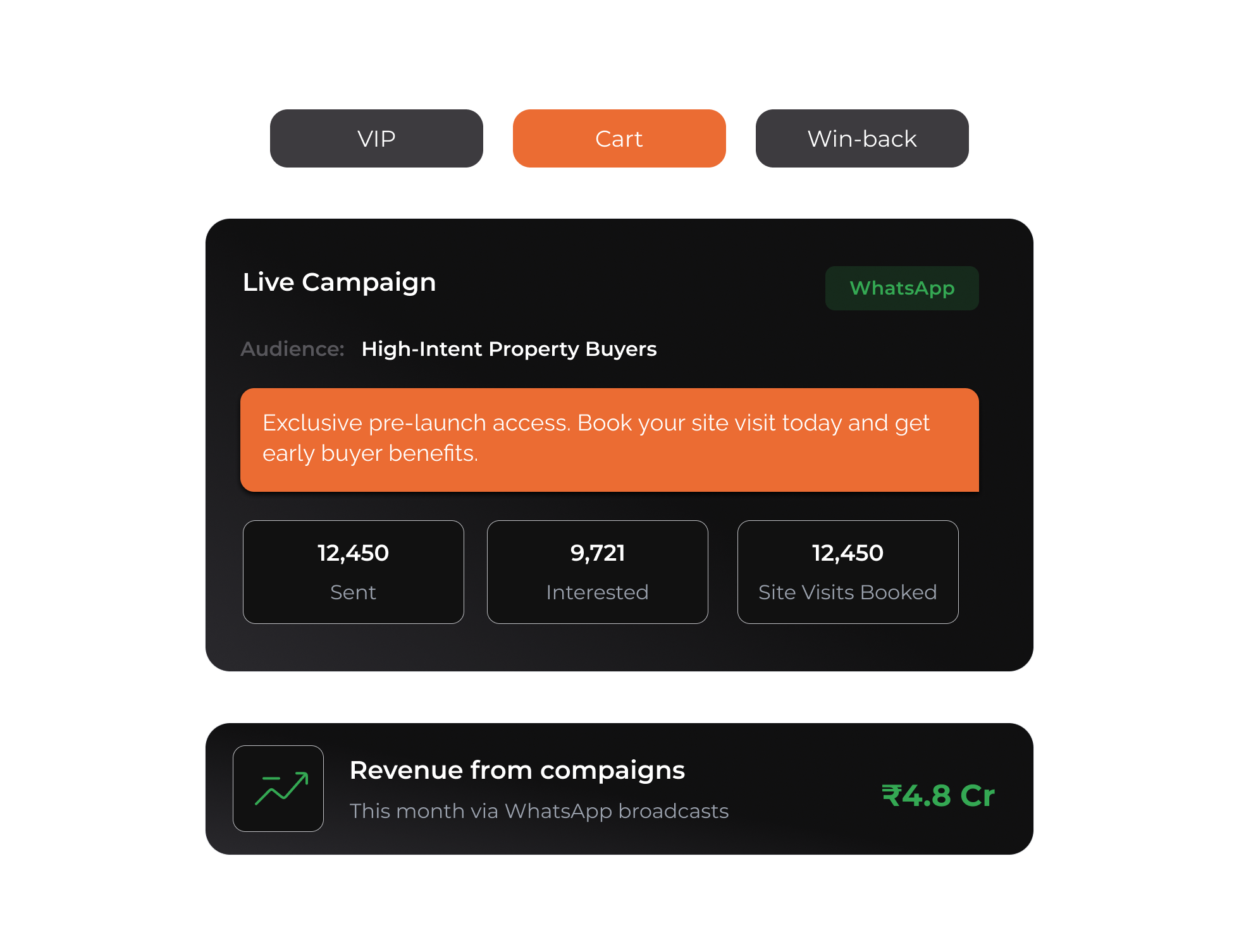 Launch personalised WhatsApp broadcast campaigns to segmented audiences in minutes. Re-engage dormant customers, recover abandoned carts, and run outbound sequences — all tracked with delivery, open-rate, reply, and revenue attribution in one dashboard.